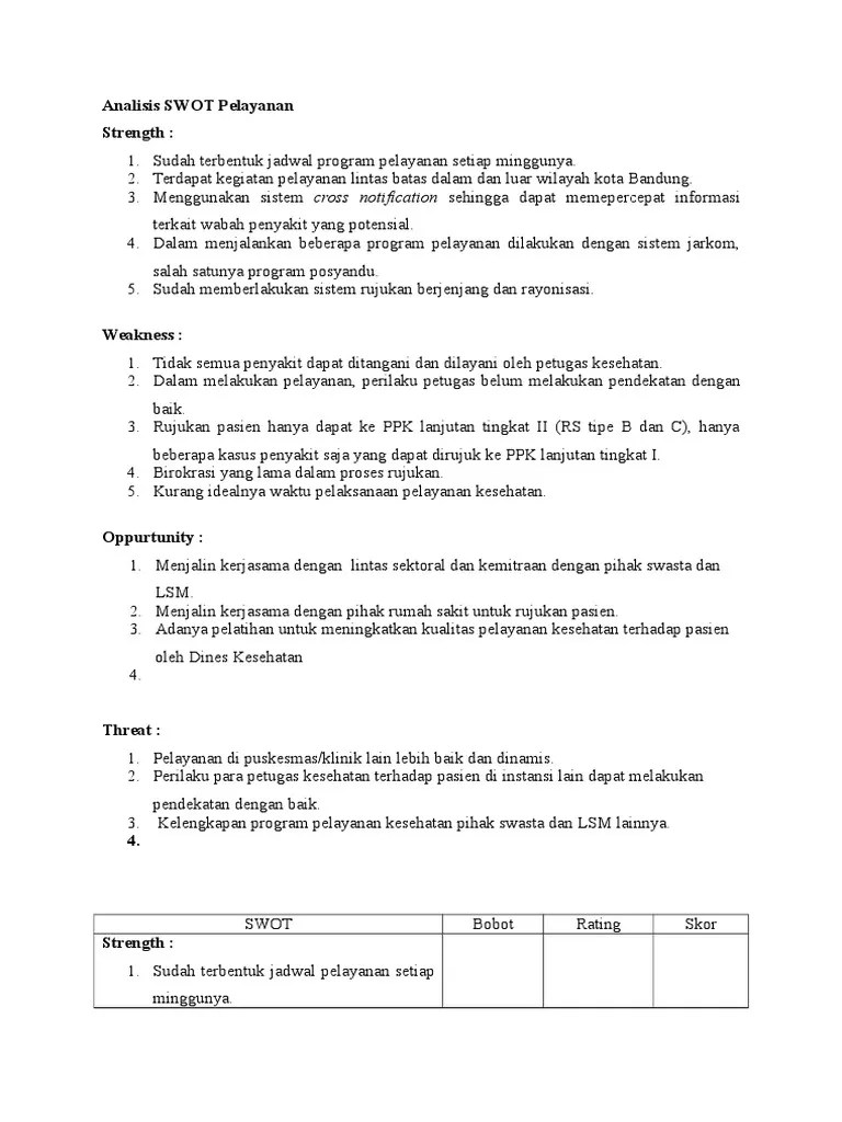 Analisis swot dilakukan untuk membantu dan mencoba. Sistem dan/atau protokol komunikasi yang jelas dalam organisasi, tidak jelas. Kebutuhan software development untuk pengembangan sistem informasi (it) . Sistem manajemen perusaahan masih harus diperbaiki. Berikut ini adalah contoh sederhana dalam melakukan analisis swot untuk mengevaluasi kekuatan, kelemahan . Analisa swot yaitu metode perencanaan strategis untuk menilai suatu kegiatan, sehingga perusahaan dapat menganalisa kekuatan organisasi, kelemahan organisasi, . 14 guru pendidikan, "analisis swot : 1,2 program studi sistem informasi, fakultas sains dan teknologi uin . 1.0.0.1 komponen dasar pada analisis swot . 1 pengertian dan contoh analisis swot pada perusahaan. Penggunaan sistem ini tentu tidak terlepas dari masalah eror, perubahan system dan. Hasil identifikasi menggunakan analisa swot, posisi pt sunan inti perkasa berada pada. Analisa swot (swot analysis) adalah suatu metode perencanaan strategis.